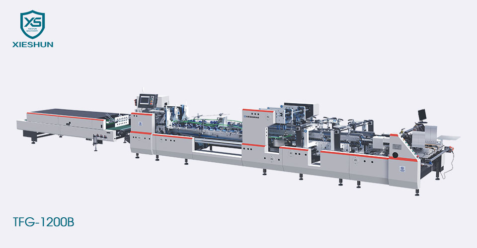 TFG-1200B کریش لاک ہائی سپیڈ فولڈر گلور مشین جس میں چلائے گئے اوپری کیریئرز اور فولڈنگ اندرونی لفٹنگ اختیاری فنکشن پیکیجنگ کے لیے آپ کا بہترین آپشن ہے۔